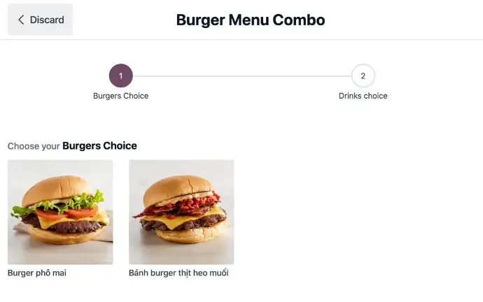 Ví dụ Combo Bánh mỳ và Nước thì khách có thể chọn bánh mỳ với nhân thịt gà hay thịt bò, giả sử khách chọn bánh mỳ với nhân thịt bò thì khách có thể được chọn tiếp là tái hay vừa hay chín. Tiếp theo khách chọn 1 trong nhiều loại nước, có thể có thêm lựa chọn có thể có phụ phí.