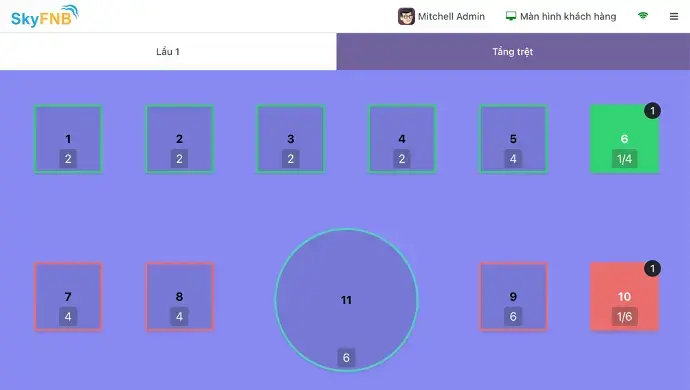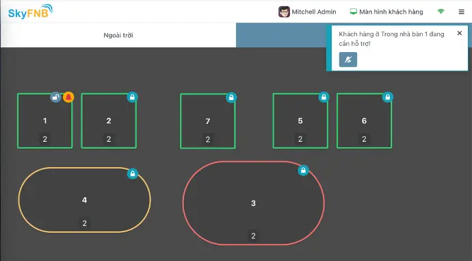 Trên sơ đồ bàn cũng hiển thị vị trí của khách và biểu tượng cái chuông để nhân viên dễ dàng hỗ trợ