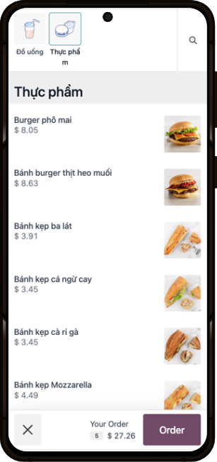 - Đơn hàng được đặt hàng từ điện thoại của khách hàng sẽ được đưa vào POS trung tâm và dưa vào Bếp giúp đẩy nhanh tốc độ phục vụ
