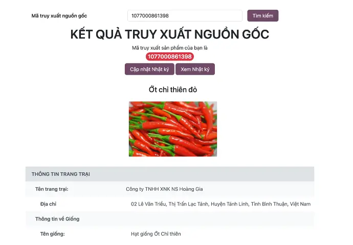 Ngay lập tức, họ sẽ được mở ra màn hình kết quả truy xuất nguồn gốc với đầy đủ thông tin về sản phẩm, bao gồm thông tin về quá trình chăm sóc, chế biến, và nguồn gốc của sản phẩm.
