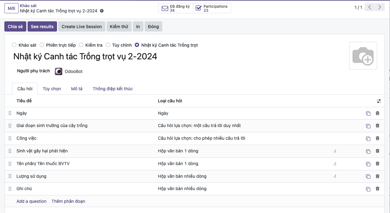 Các trường dữ liệu có thể được hiển thị hay không theo điều kiện, ví dụ nếu công việc là bón phân thì câu hỏi tiếp theo là loại phân bón và lượng sử dụng